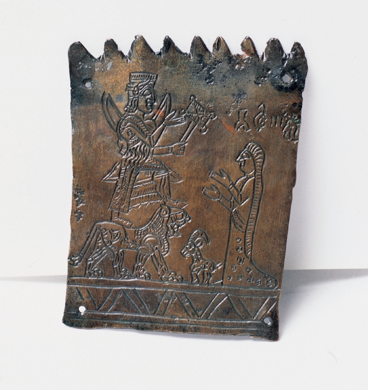 Mostly depictions of god were placed on the “Bronze Votive Plaques” which it is understood that it was formed by re-processing bow parts and encountered in Urartu geography frequently. In these depictions, the depiction of God is usually standard. The god, who stands on an animal standing position, usually holds a gun and has a bow. He extended his other hand to slightly forward by breaking from the elbow. They wear a tunic extends up to wrists on a short skirt. Dress edges are tasselled or embroidered. It is also seen that the dress is made of a patterned fabric. God always has a horned hood. One example is remarkable in terms of the subject. A woman's figure is in the position that lifts up her hands and prays was handled in the face of the depiction of the god. As in similar examples, the head of woman, wearing a long geometric patterned tunic, is covered with another cover that extends down to the bottom of the waist with horizontal pattern. The goat in front of the woman probably depicts the animal sacrificed.